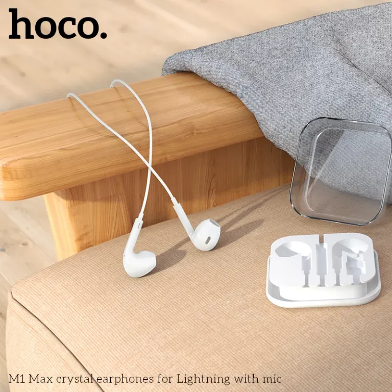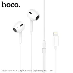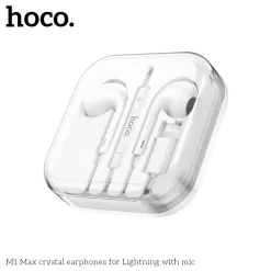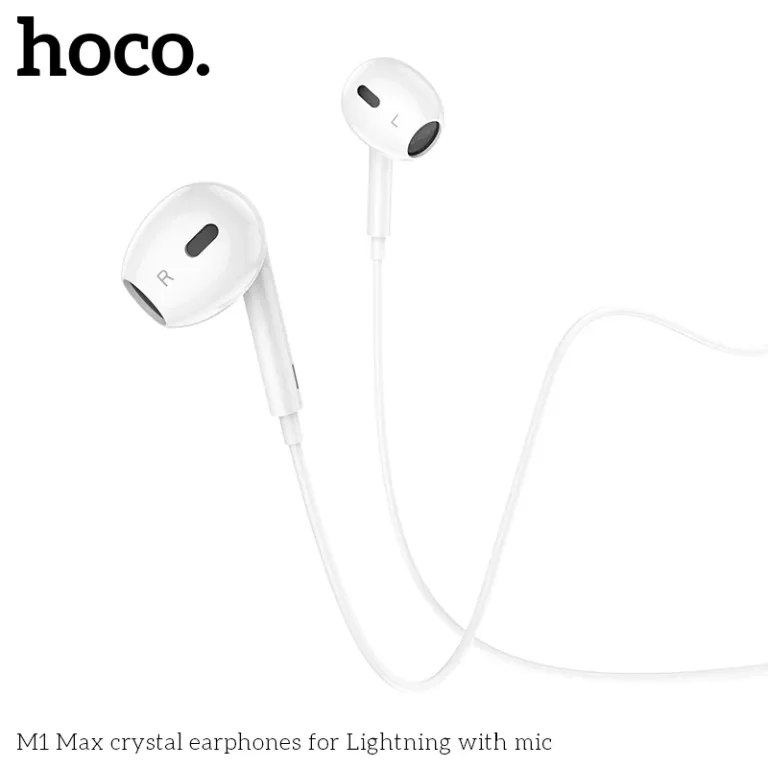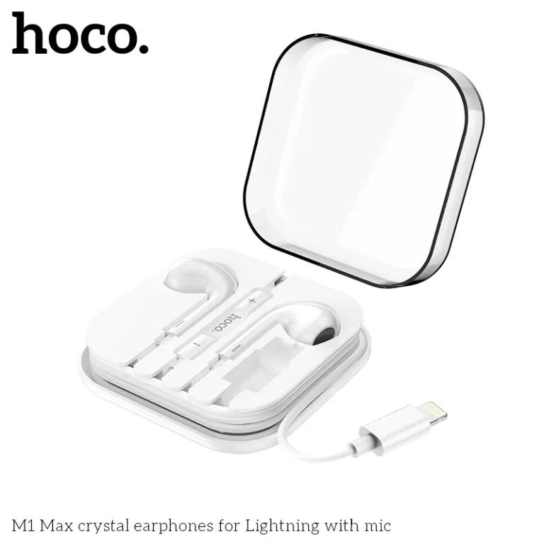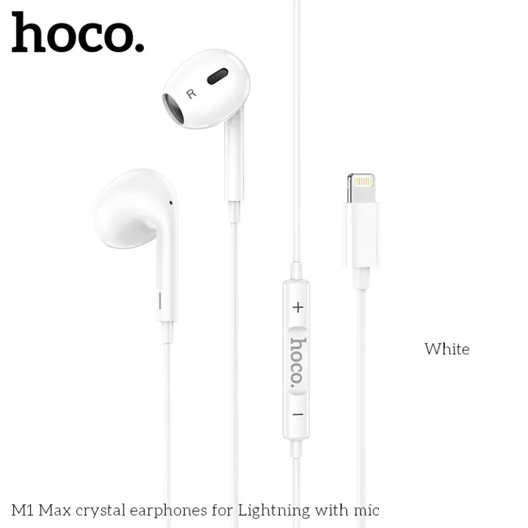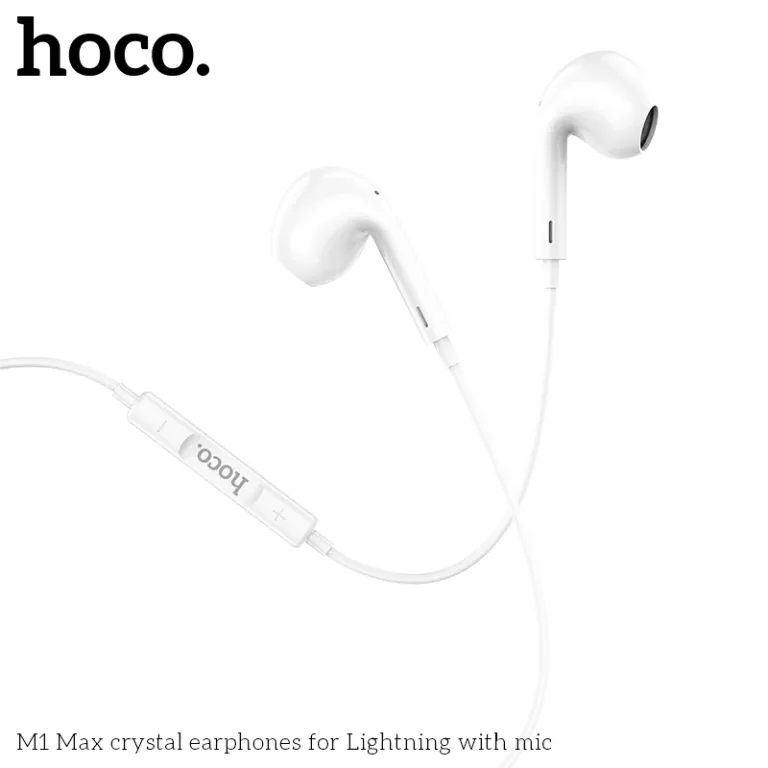 Hoco M1 Max sử dụng cổng Lightning kết nối trực tiếp với iPhone, iPad, hỗ trợ điều khiển nhạc, âm lượng và nhận cuộc gọi qua nút trên dây dài 1.2m chống rối. Driver loa 12-14mm cho âm thanh HiFi, bass sâu, tần số 20-20.000Hz, trở kháng 32Ω và độ nhạy 116dB tương thích chuẩn Apple. Housing nhẹ, tips silicon êm tai, một số phiên bản tích hợp chip DAC nâng cao chất lượng âm.